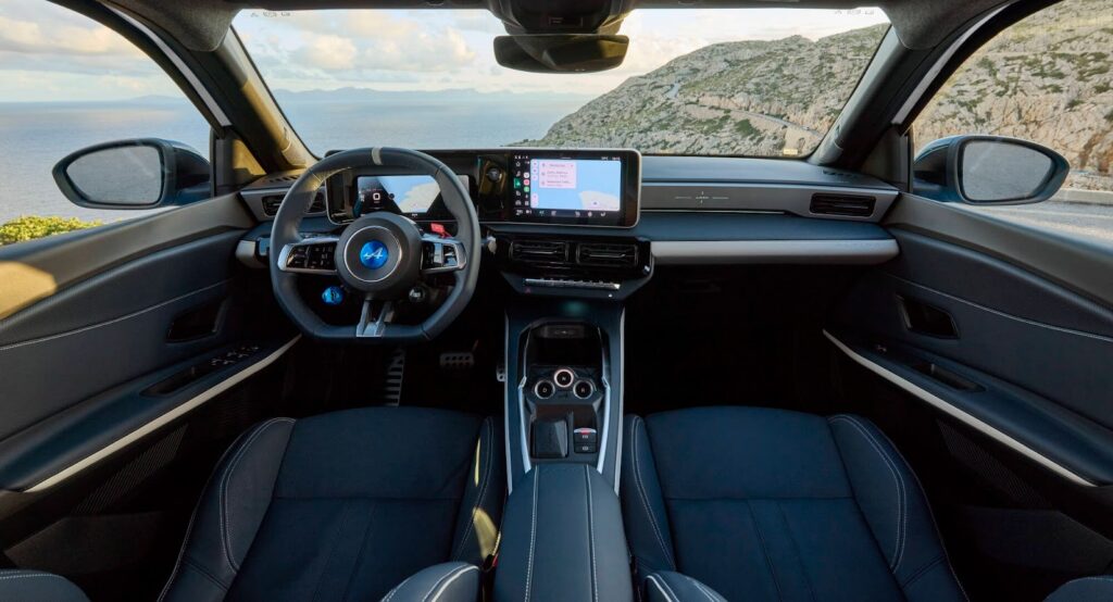 Alors, un premier tableau se dresse à moi, un intérieur qualitatif et dans l’air du temps, avec un système d’exploitation Google, probablement le meilleur du marché, un extérieur travaillé donnant une identité propre a l’A290. Alpine nous offre en plus 5 version différentes, et comme au début de l’A110, s’y retrouver n’est pas chose aisée. Il y a deux grandes familles, la GT et GTS. La GTS se déploie en 3 catégories : GT, GT Performance, GT Premium. La version GT, qui commence à un attractif 36.000 euros développe 180 chevaux et 285 Nm de couple, ces statistiques sont les mêmes pour la GT Premium, qui propose quelques options en plus pour 39.900 euros. La GT Performance, pour autant, propose 220 chevaux et 300 Nm de couple pour 39.700 euros. Maintenant, la version GTS, démarrant a partir de 42.700 propose les mêmes caractéristiques que la version GT Performance et propose notamment des pneus Michelin plus orientés sport. Pour terminer, il y a la version Première Édition avec toujours 220 chevaux et 300 Nm mais avec certaines options en plus et une plaque numérotée dans l’habitacle. Toutes sont équipées de la batterie de 52Kwh. Pour une version avec une batterie plus petite et donc moins cher il faudra surement attendre la version de Renault, R5 Esprit Alpine.