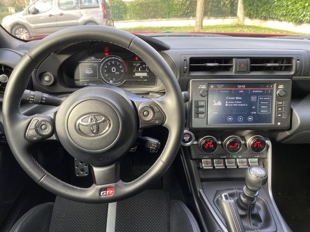 Mais ce que nous voulons vraiment savoir, c’est si la méthodologie choisie par Toyota pour améliorer le jeu de la GT86 a conservé l’esprit brut et l’honnêteté de l’original ? En d’autres termes, le bébé est-il encore en train de barboter dans l’eau du bain ? Non, la GT86 n’était pas parfaite, loin de là. Je n’ai pas souvenir d’un autre coupé sportif qui ait brouillé la frontière entre plaisir et frustration de manière aussi experte. Mais d’une manière étrange, les défauts perçus – le besoin de monter en régime étant donné le manque de couple à bas et moyens régimes du moteur 2 litres à plat à aspiration naturelle, la sonorité brute et graveleuse du moteur, la conduite inflexible sur un tarmac moins lisse qu’une table de billard, l’intérieur plutôt spartiate – ajoutaient un peu de caractère à un concept à moteur avant et à propulsion arrière par ailleurs immaculé, même s’il était stratégiquement handicapé au niveau de l’usure du caoutchouc pour générer plus de divertissement à des vitesses inférieures. Le très apprécié manuel de Toyota “Sir Skid-a-lot”.