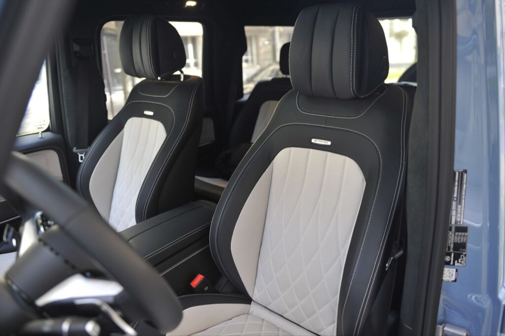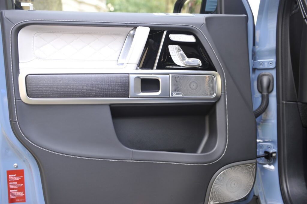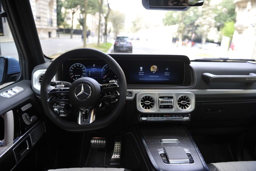 Mais en escaladant dans le siège, se trouvant à 1 mètre du sol, on trouve un intérieur avec la même architecture mais très différent sur le plan technique. Ici, l’ancien système, non tactile et avec sa roulette, laisse place au MBUX avec un écran tactile, et dit aussi adieu à l’ancien volant AMG pour cette nouvelle version plus ronde avec une jante plus grosse. On retrouve aussi un nouveau combiné d’instrumentation et quelques changements ici et là. Dans l’absolu, la personne connaissant le Classe G de 2018 sera à son aise et même mieux accueillie dans cet nouvel intérieur. L’un des éléments qui reste le même est la qualité de fabrication. C’est au niveau d’une Classe S, voire d’une Bentley. La contre-porte est un modèle de design avec ses poignées affleurantes, l’enceinte Burmester parfaitement intégrée, les contrôles pour le siège… La position de conduite est toujours aussi absurde : vous êtes assis comme dans une chaise de bureau avec vos genoux pliés à 100 degrés, le dos droit et le combiné d’instruments est toujours à 10 cm du pare-brise. C’est la beauté du Classe G, le fait qu’il donne une expérience si unique par rapport à toutes les autres voitures mais notamment les sportives. Quelques minutes auparavant, avant de monter dans ce G63, j’étais dans une Porsche RS Spyder, tout l’inverse : un siège si près du sol que l’on peut toucher la route avec la main, une position des jambes allongées, un volant loin du pare-brise… Passer de l’un à l’autre permet de voir toute la diversité qu’offre le milieu de l’automobile.