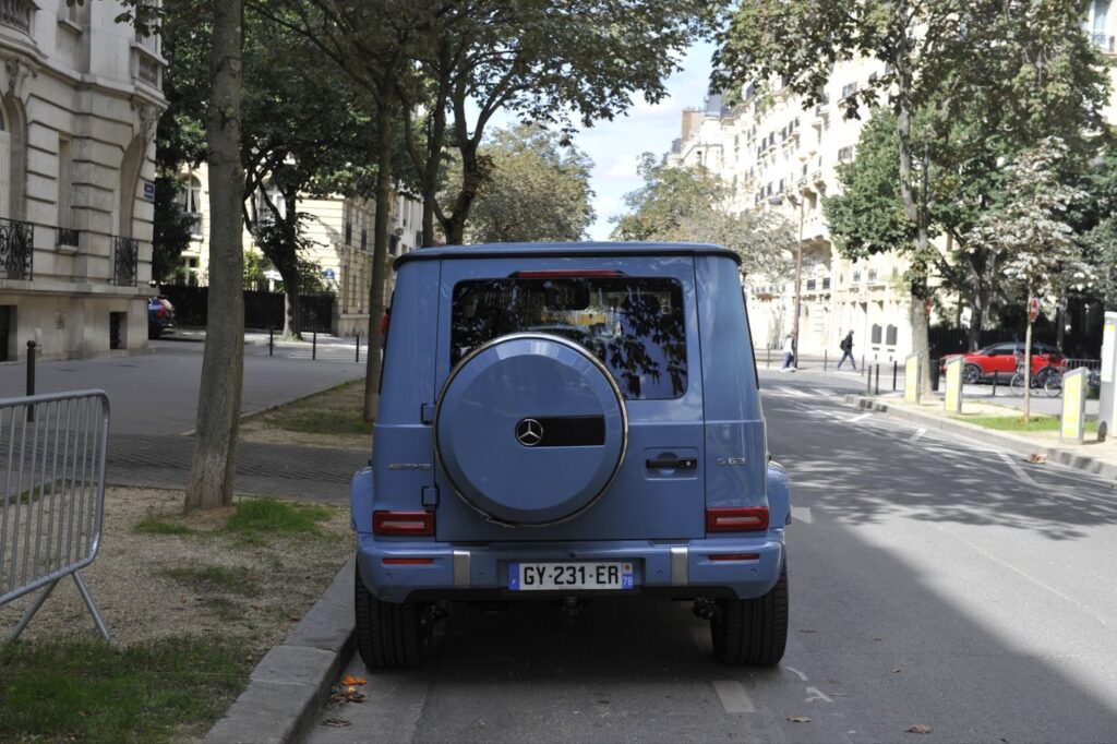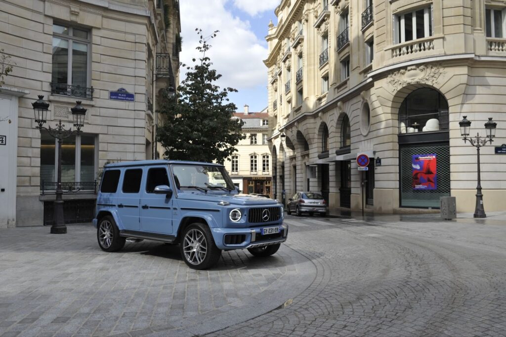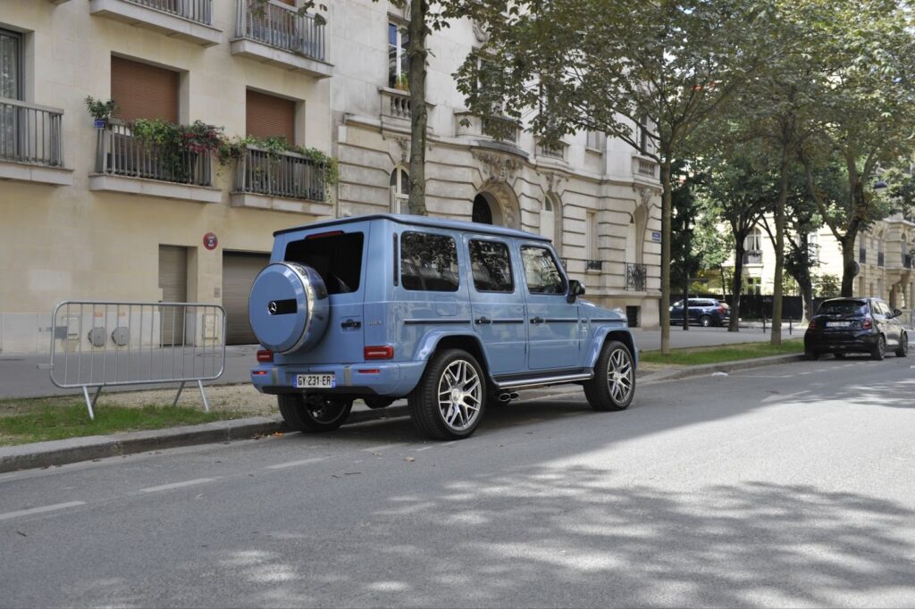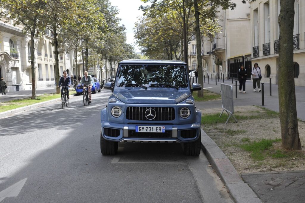 En ville, c’est un sentiment de protection qui domine notre évolution. On est plus haut que toutes les autres voitures, mais le G63 est aussi plus puissant : se faufiler dans le trafic est donc aisé. Par rapport au GLS ou au X7, le Classe G est tellement carré que ses dimensions sont faciles à apprivoiser en ville. Sur le périphérique, à 70 km/h, c’est vraiment la bonne vitesse pour le G63. Peu de bruit d’air, la boîte à 9 rapports tourne à peine au-dessus de 1000 tr/min. Sur autoroute, les bruits d’air sont plus présents, moins sur cette version 2025 que sur la version 2018, notamment grâce à un arrondissement entre la jointure du pilier A et du pare-brise. Ça reste toujours moins silencieux qu’un GLS, avec son pare-brise plus incliné. Malgré les jantes de 22” et la largeur des pneus qui apportent des bruits de roulement dans l’habitacle, il sera possible de faire de longs trajets avec ce Classe G, porté par la sono Burmester et les sièges au confort parfait.